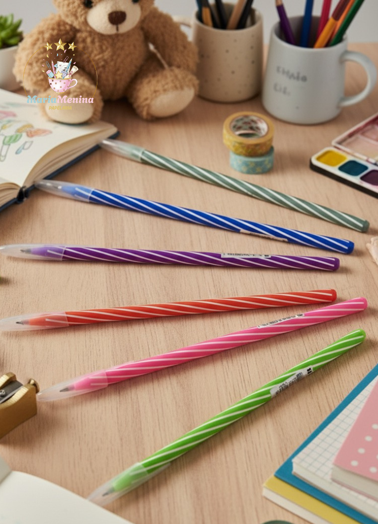 Design Listrado/Espirado (Spiro): O corpo de plástico flexível é geralmente decorado com um design listrado em espiral (Spiro), que além de conferir estilo, ajuda a identificar a cor da tinta.