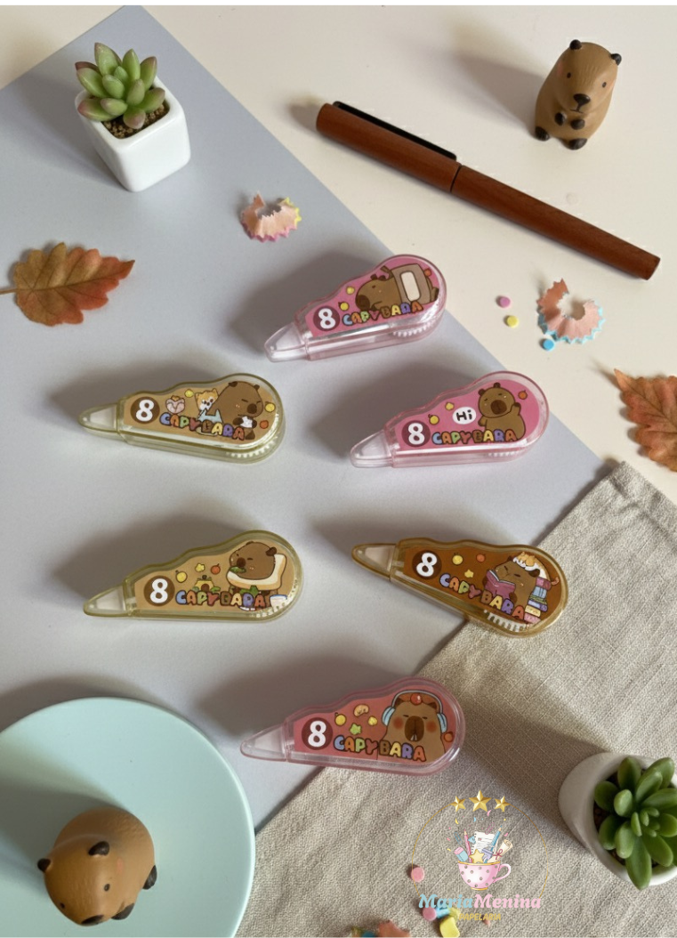 Design de Capivara: O corpo do corretivo possui um formato que lembra vagamente uma capivara deitada ou temático da cabeça dela, com adesivos ou estampas representando a Capivara em diversas situações engraçadas e aconchegantes (como tomando banho, relaxando com fones de ouvido, ou tomando café).