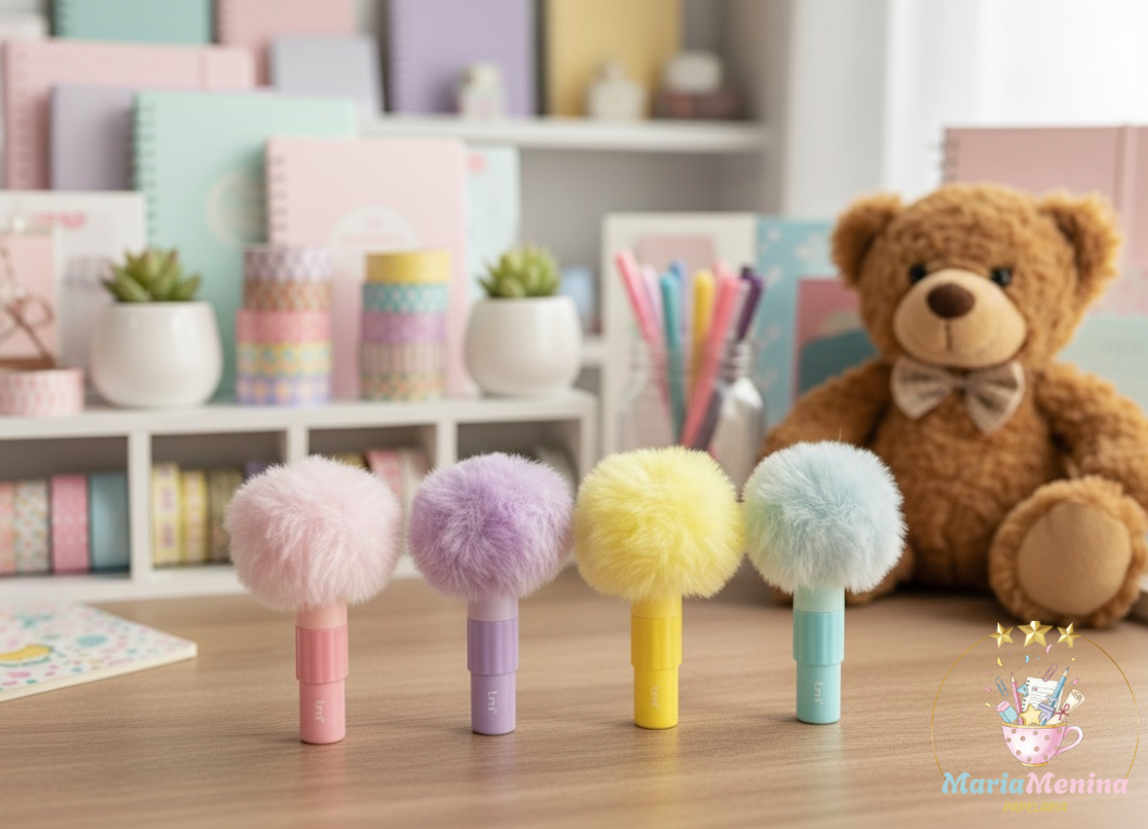 Pompom de Pelúcia: O elemento principal e mais chamativo é o pompom de pelúcia fofo preso à extremidade da tampa do marcador. O pompom geralmente é macio e de cor coordenada com o corpo da caneta, adicionando um toque cute e colecionável.